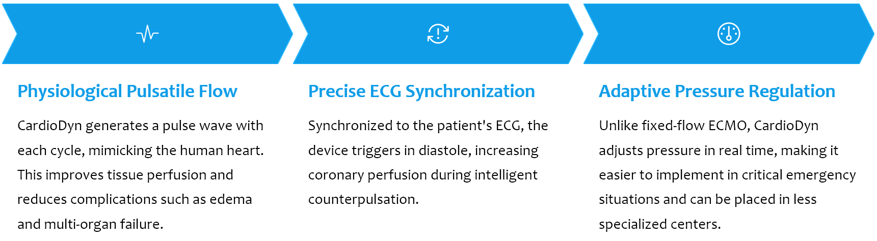 Contrairement à l'ECMO standard à flux continu, il délivre une onde de pouls physiologique synchronisée avec l'ECG en contre-pulsion cardiaque, assurant à la fois une meilleure perfusion coronarienne et distale, et permettant la vidange cyclique des cavités cardiaques.