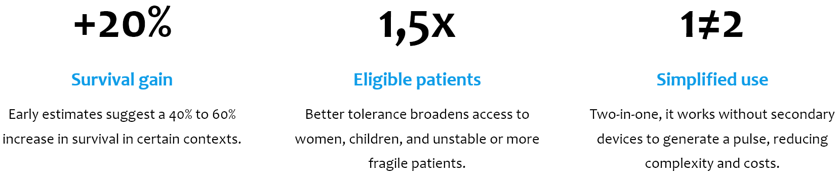 Face à la stagnation des taux de survie avec les dispositifs ECMO standards — oscillant entre 35 % et 50 % depuis deux décennies — CardioDyn apporte une réponse concrète à l'un des plus grands défis des soins intensifs : améliorer la survie et l'éligibilité des patients en insuffisance cardiaque aiguë.