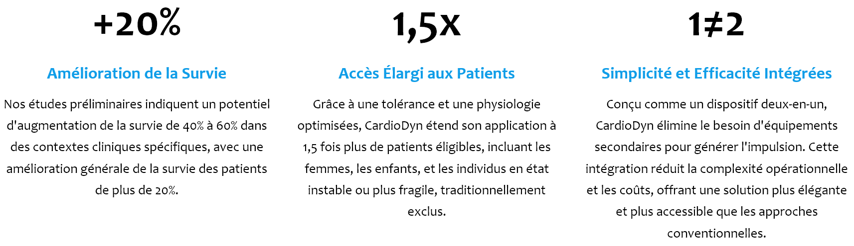 CardioDyn élargit ainsi l'accès à une assistance vitale, offrant une prise en charge plus sûre, mieux tolérée et plus efficace. En redéfinissant les standards de l'assistance cardiaque temporaire, il ouvre la voie à une médecine plus accessible et plus performante.